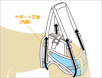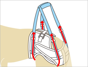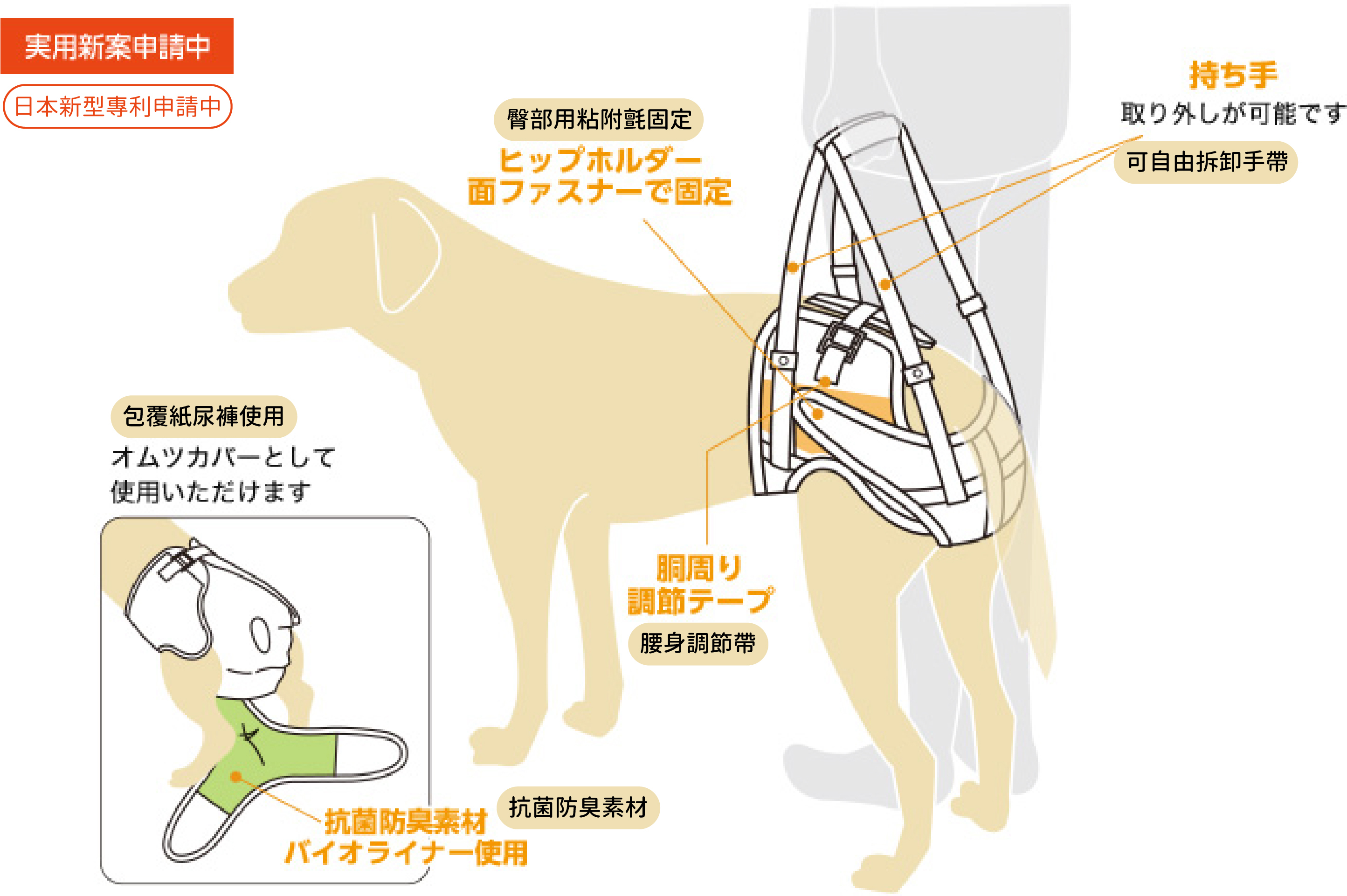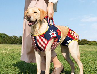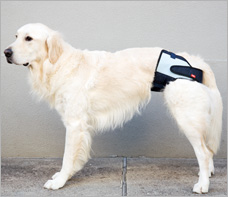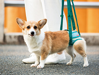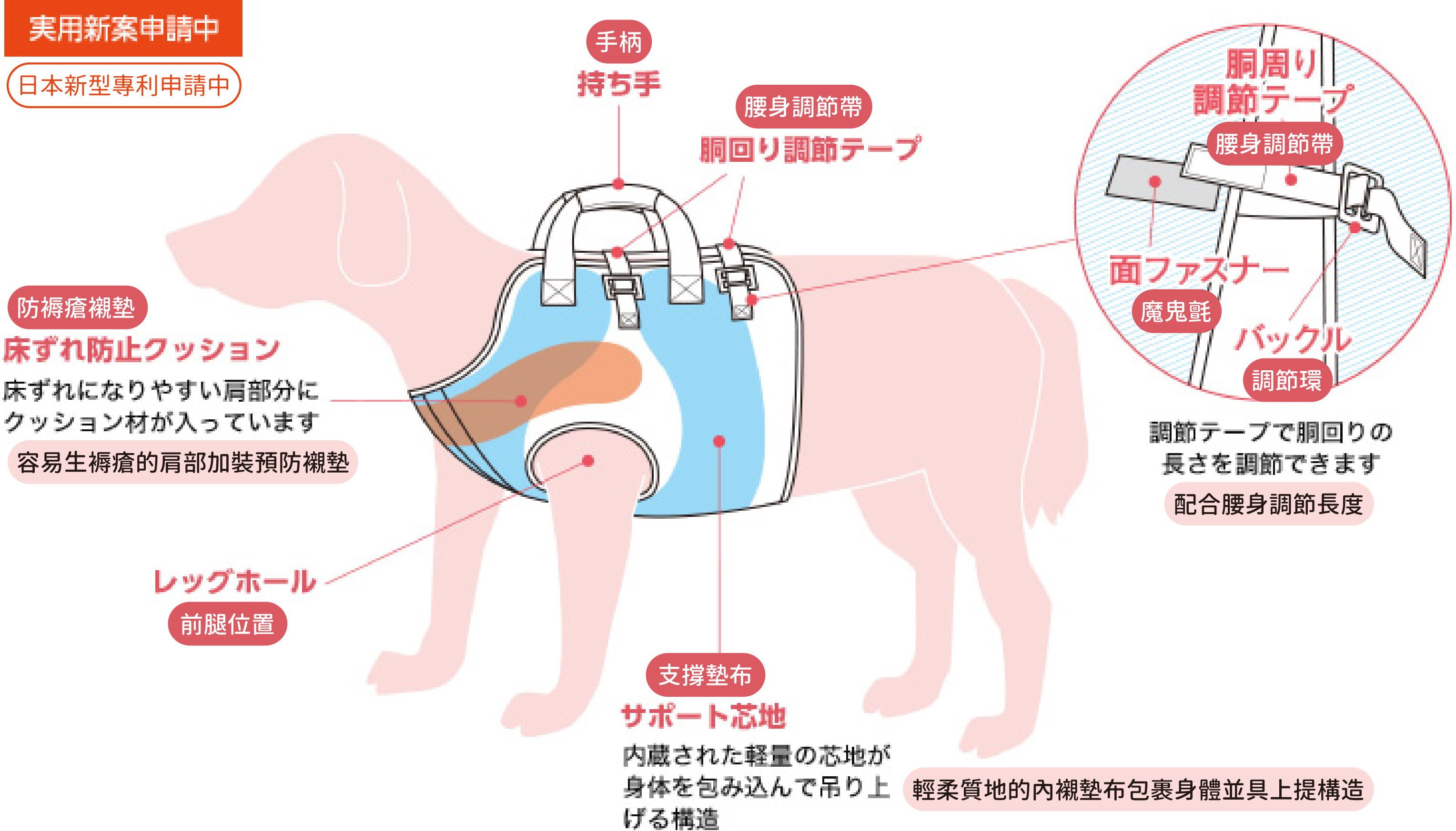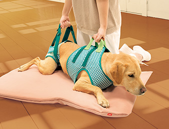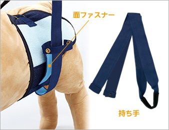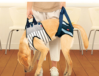 透過特製的輔助帶,讓腿部力量逐漸衰退的狗狗,能在主人的給予協助下繼續行走,達到輔助狗狗腿部肌肉力量的效果。