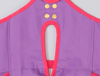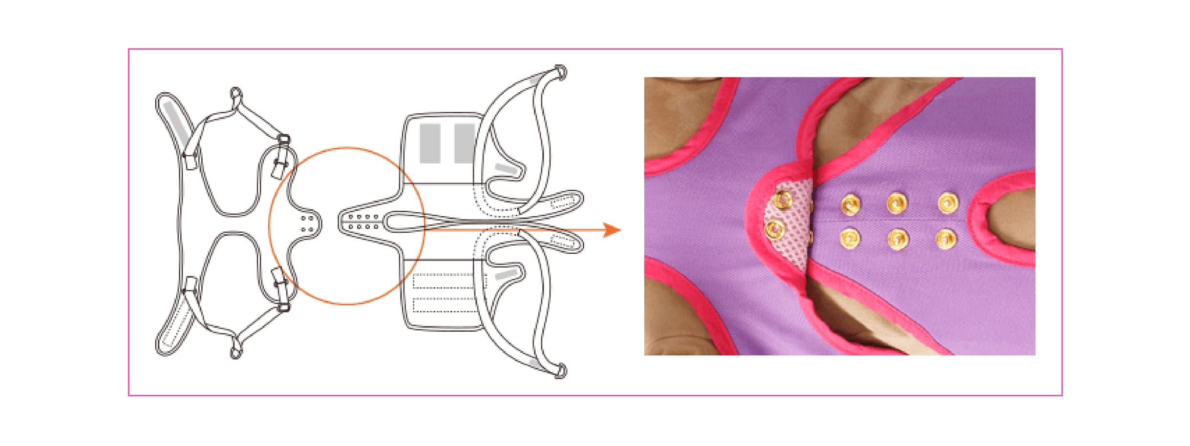 胸部及軀幹區段之間的連結點採用三排扣設計,可根據毛孩的體態及髮量進行調整,其中扣子間距2.5cm