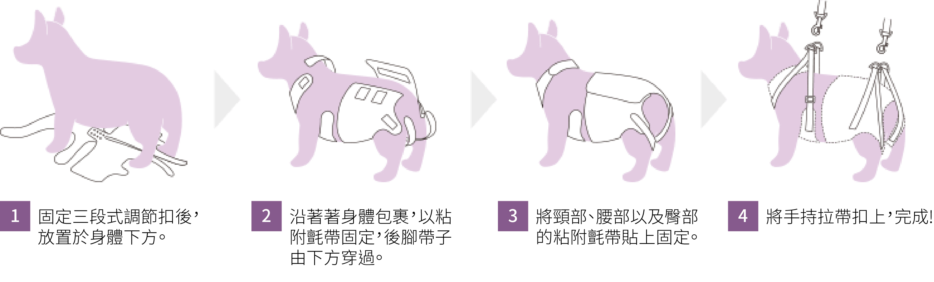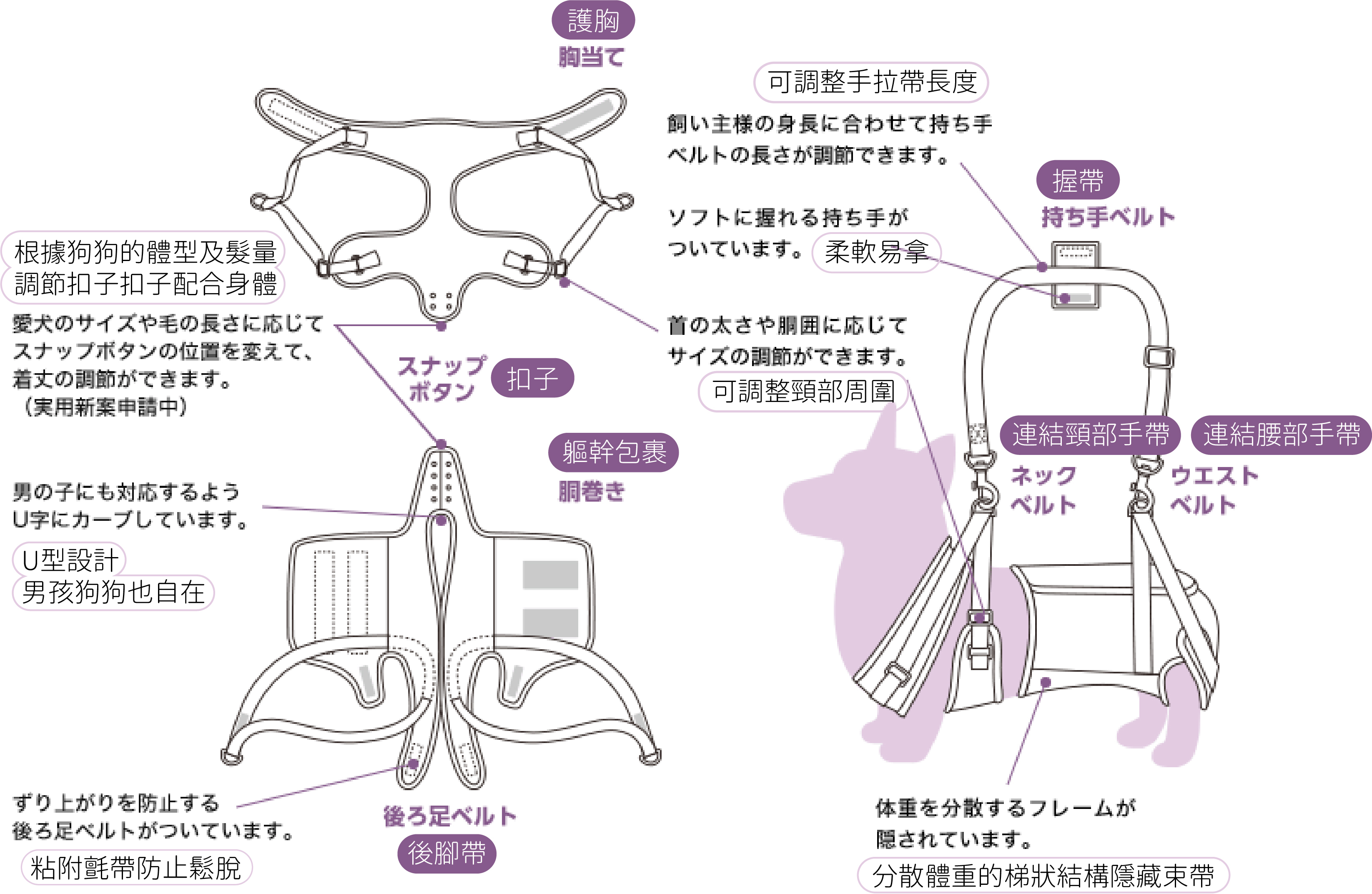 04.隱藏在軀幹部分的梯狀結構束帶,可分散狗狗的重量,防止勒住身體。