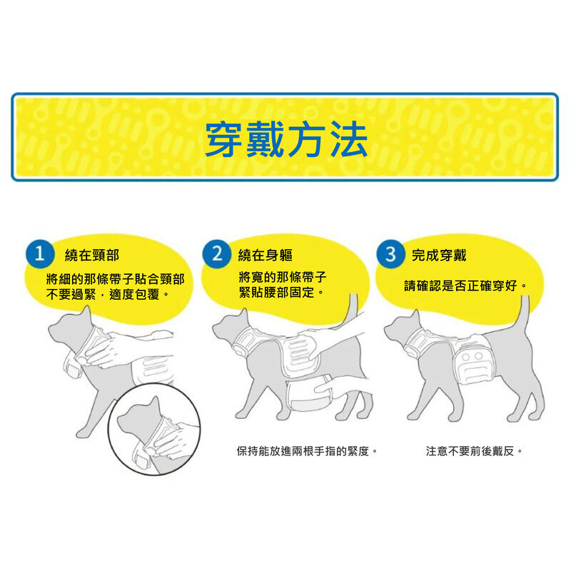→ 請由背部像抱住般幫牠穿上,先固定頸部再調整身體,會更容易操作。