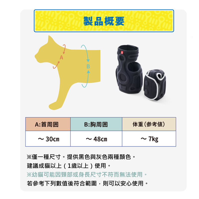 → 適用胸圍 48cm 以內、7kg 左右的貓咪,若接近臨界尺寸,建議先與我們洽詢。