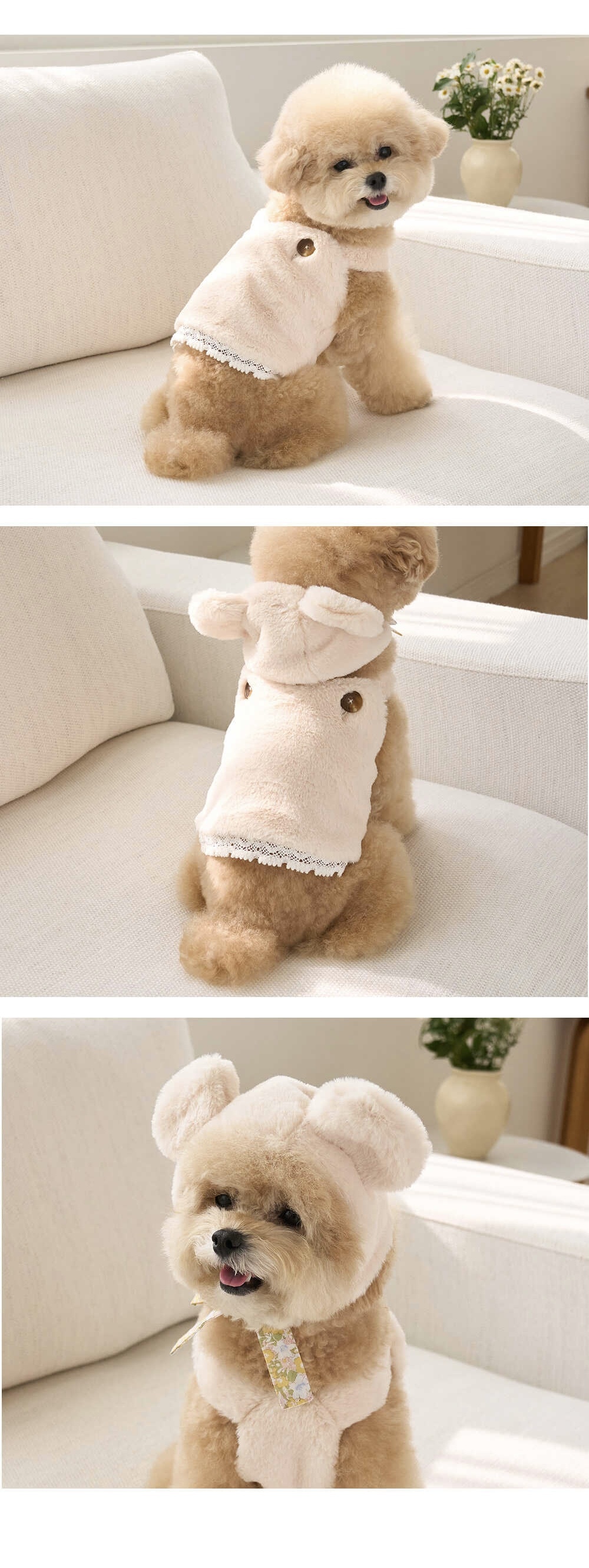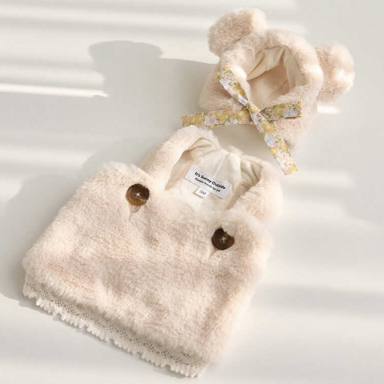 造型帶有泰迪熊耳朵的毛茸茸帽,點亮商品特色,與毛茸茸保暖背心搭配在一起更可愛。在寒冷的冬天也能擁有出色保暖的產品。它也可以像不戴着,也可以掛戴在脖子上像連帽外套一樣展現。