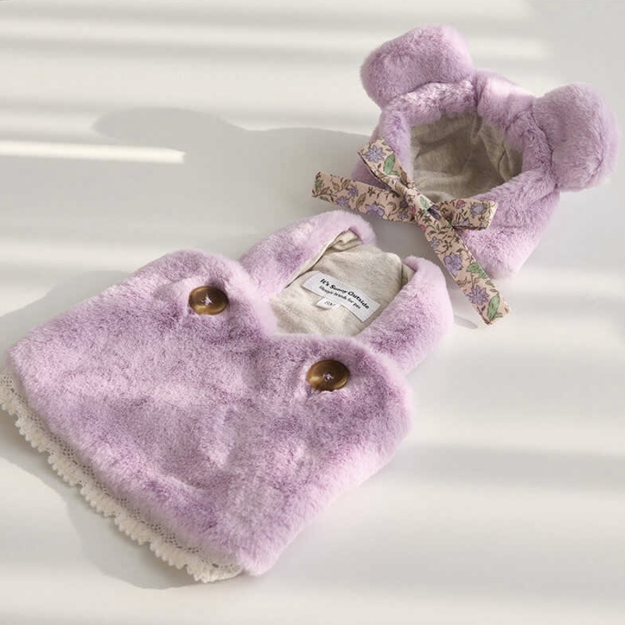 造型帶有泰迪熊耳朵的毛茸茸帽,點亮商品特色,與毛茸茸保暖背心搭配在一起更可愛。
