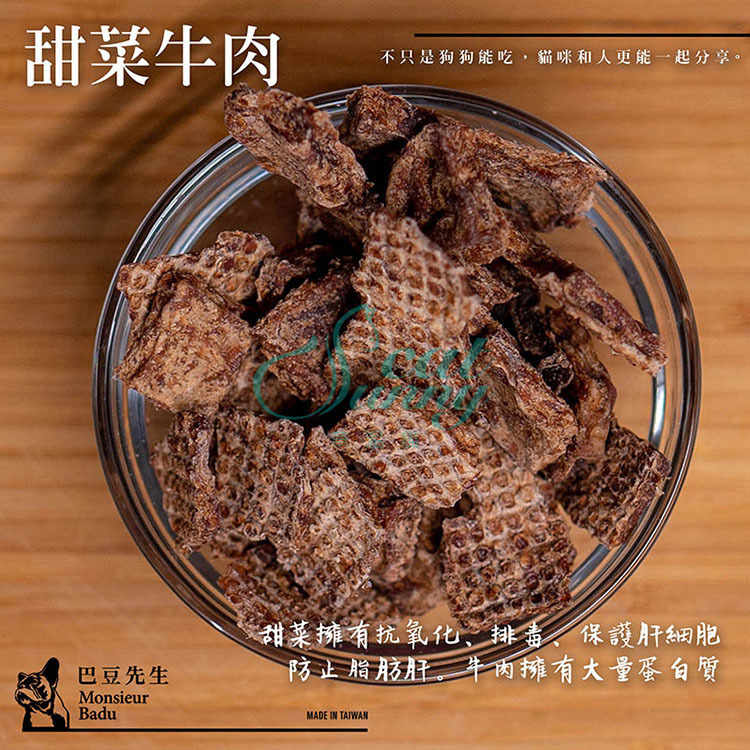 牛肉:擁有大量蛋白質,甜菜:擁有抗氧化等優點。巴豆先生系列 / 甜菜牛肉塊 硬脆 成分:牛肉、甜菜根、薯粉、生素C、維生素E、甘胺酸