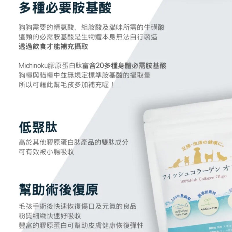 ◎【100%天然】 膠原蛋白豐富海驢萃取 ◎【細分子】900Da分子量 犬貓好吸收 ◎【犬貓必需胺基酸】附含20多種 犬貓必需胺基酸 如狗所需精胺酸 貓咪所需牛磺酸 ◎【關節健康】 維持足部、腰、關節的健康 ◎【美毛護膚】增加角質層保水力 維持細胞健康功能 再生毛髮 毛色亮麗