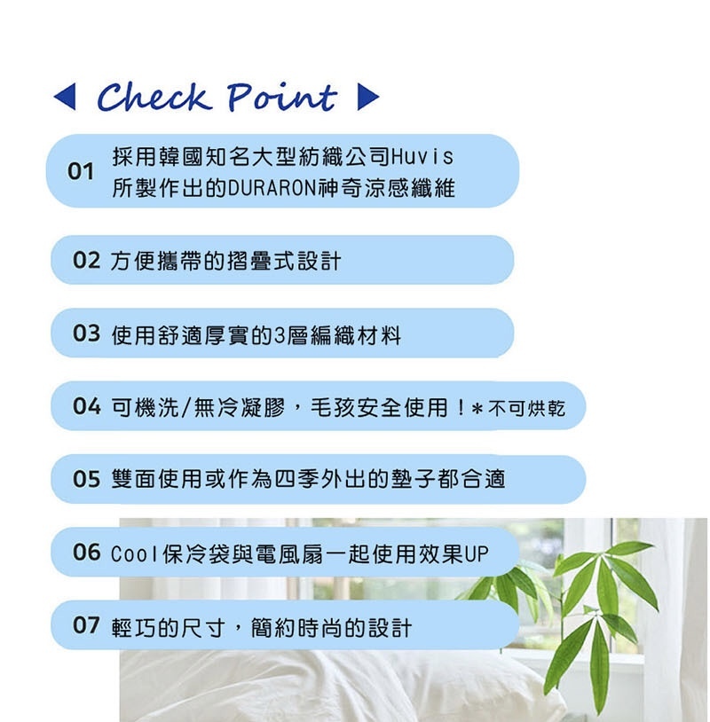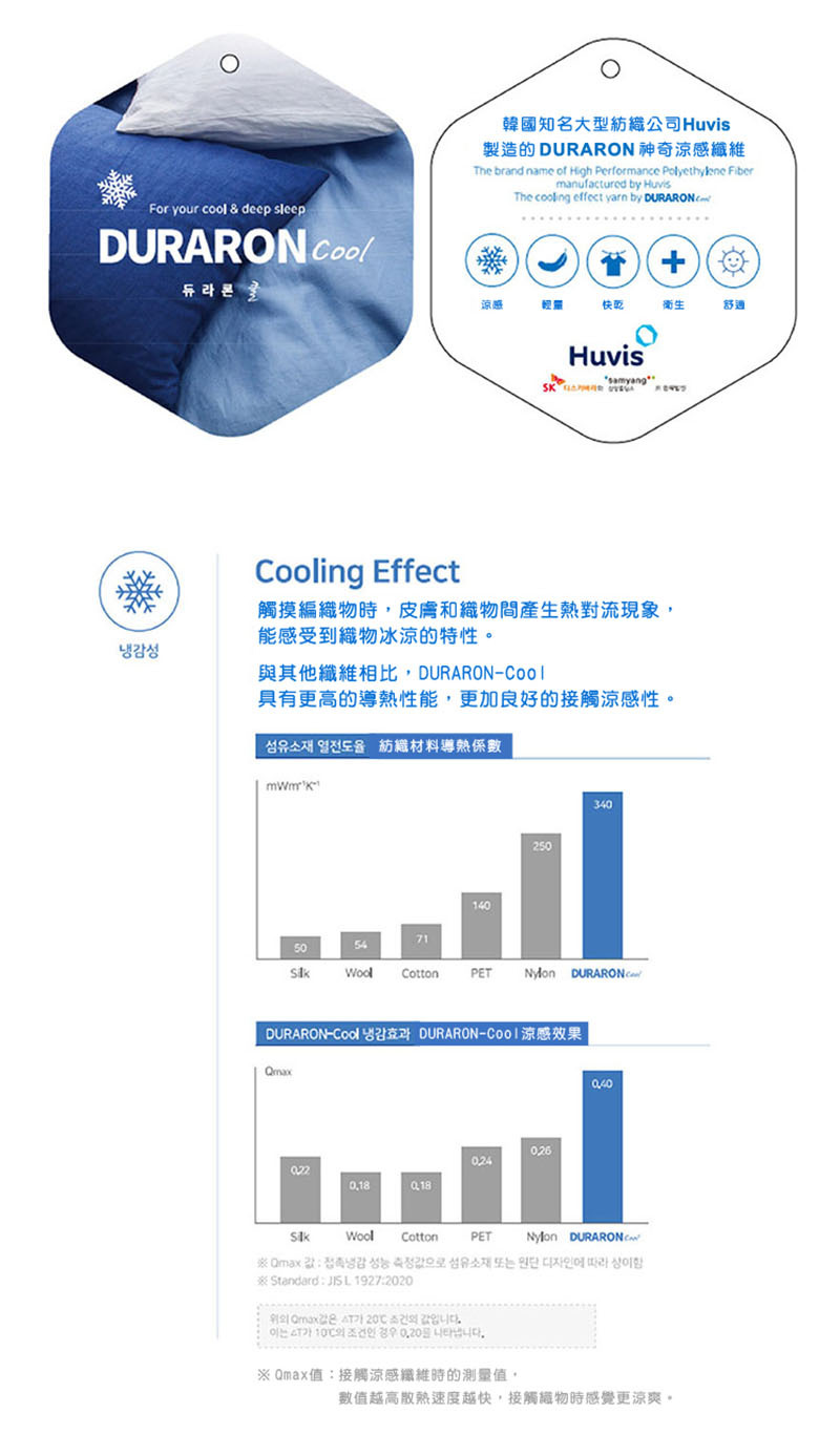 採用韓國知名大型紡織公司Huvis所製作出的DURARON神奇涼感纖維,