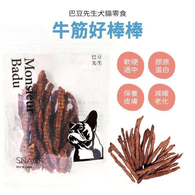 牛筋含有豐富膠原蛋白,具耐咬姓,可幫助毛孩排解、放鬆情緒,同時保養皮膚,並減緩老化