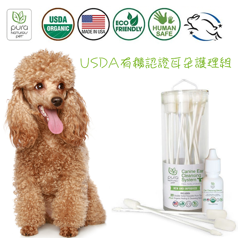 【USDA有機認證】寵物專用耳朵護理組 (有機長效型潔耳精華液 1oz, 15支可重複使用Pura-Tips™ 雙頭清耳棒 ) 美國自然獸醫認證