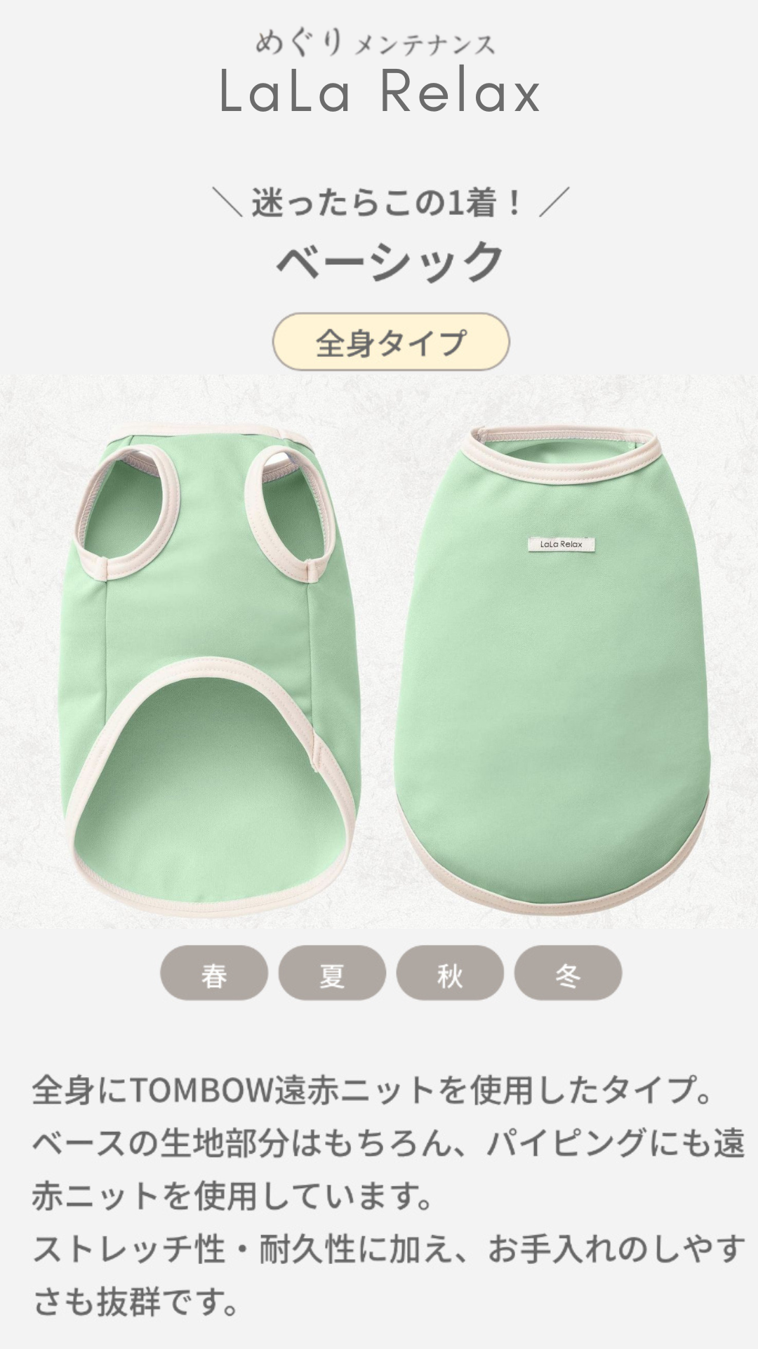 全身遠紅布料、促進循環、維持體溫,四季皆宜。最具「LaLa Relax」象徵性的經典款。