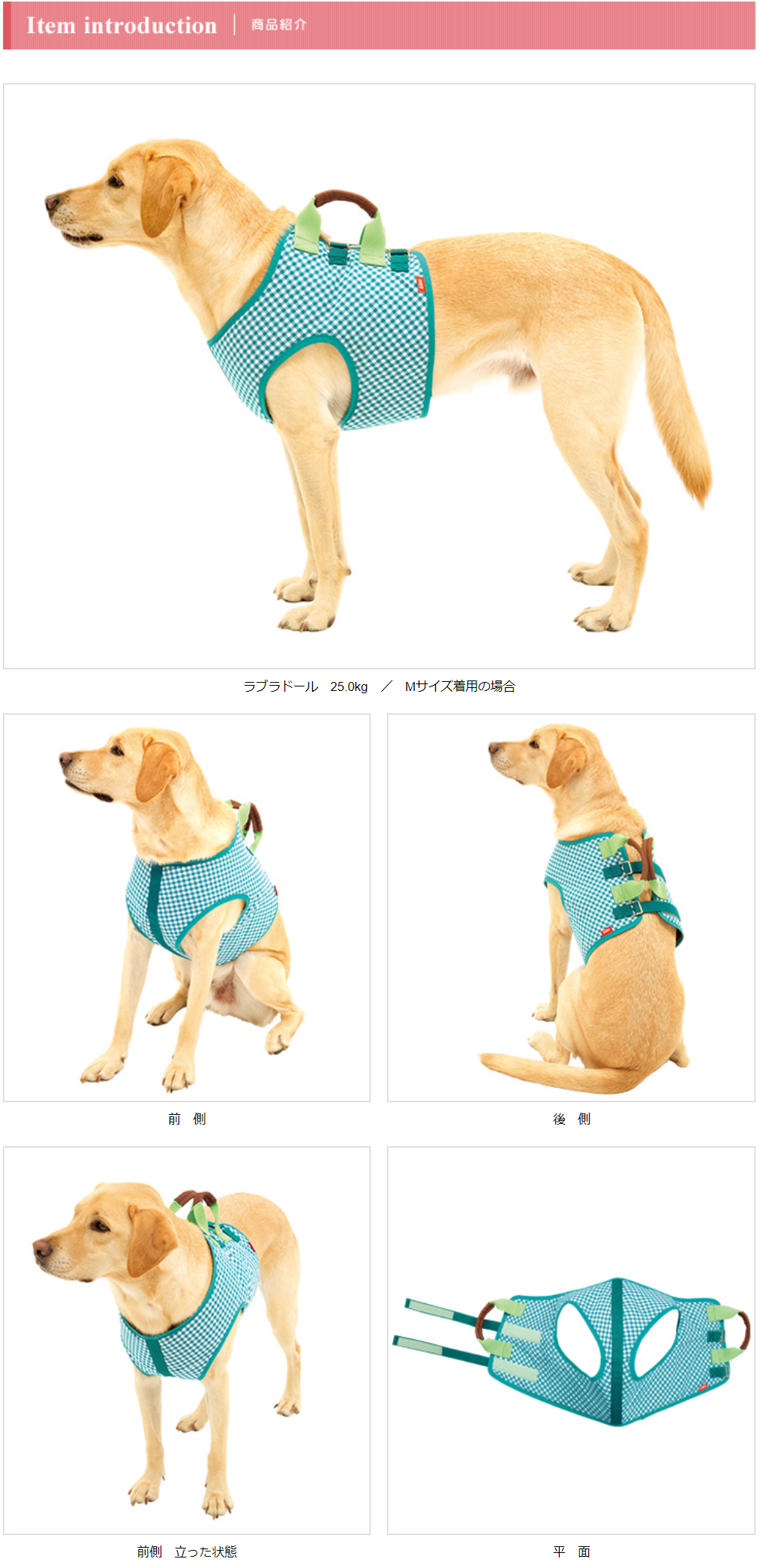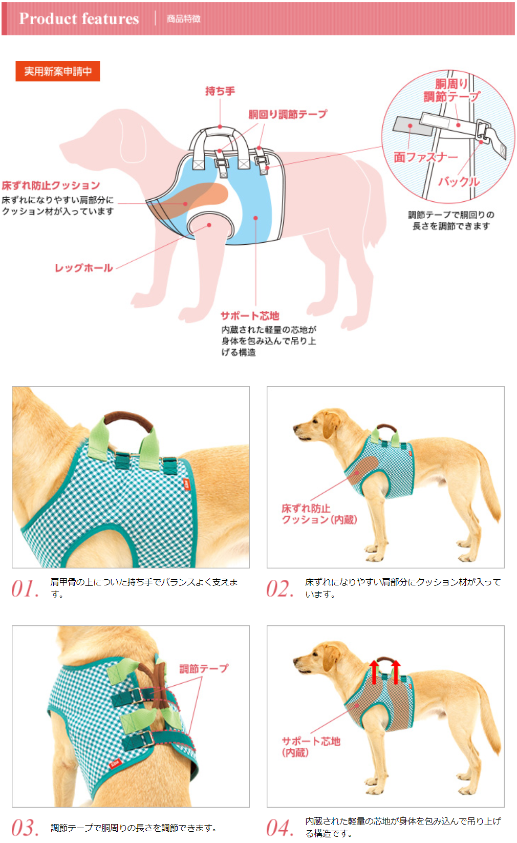 透過特製的輔助帶,讓腿部力量逐漸衰退的狗狗,能在主人的給予協助下繼續行走,達到輔助狗狗腿部肌肉力量的效果。