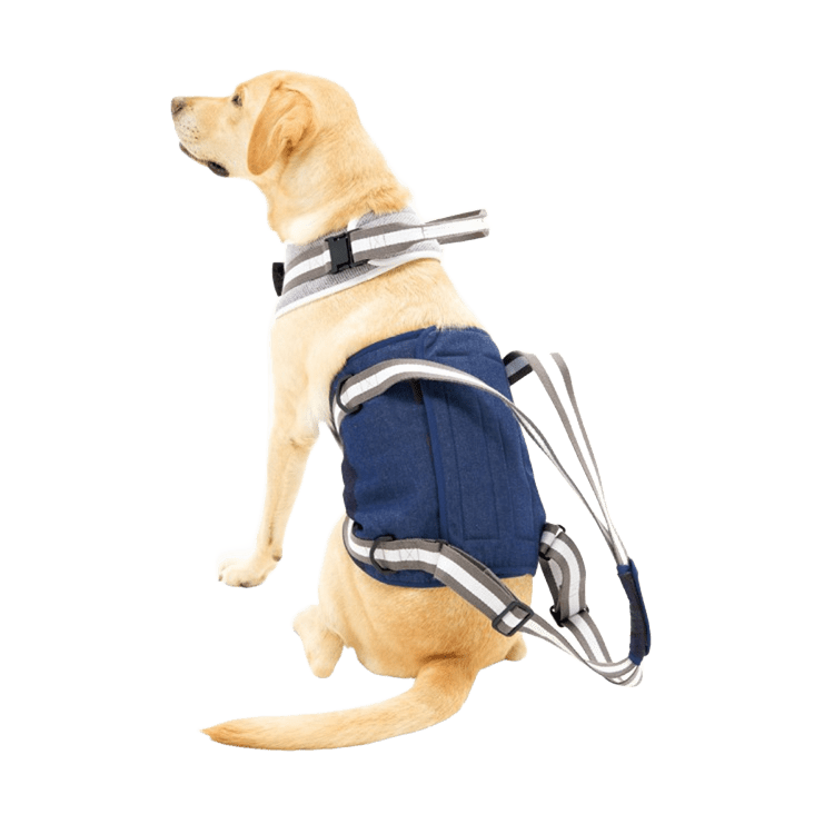透過特製的輔助帶,讓腿部力量逐漸衰退的狗狗,能在主人的給予協助下繼續行走,達到輔助狗狗腿部肌肉力量的效果。