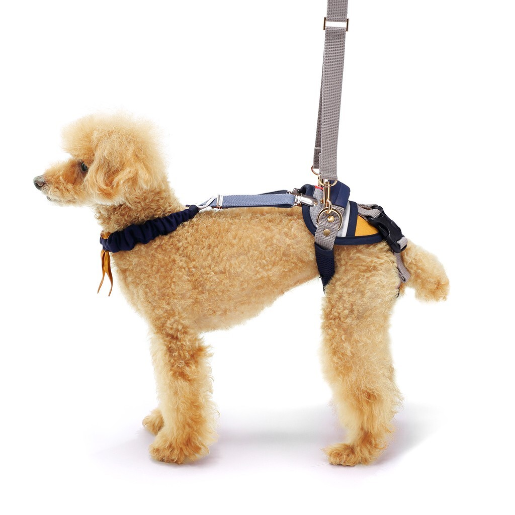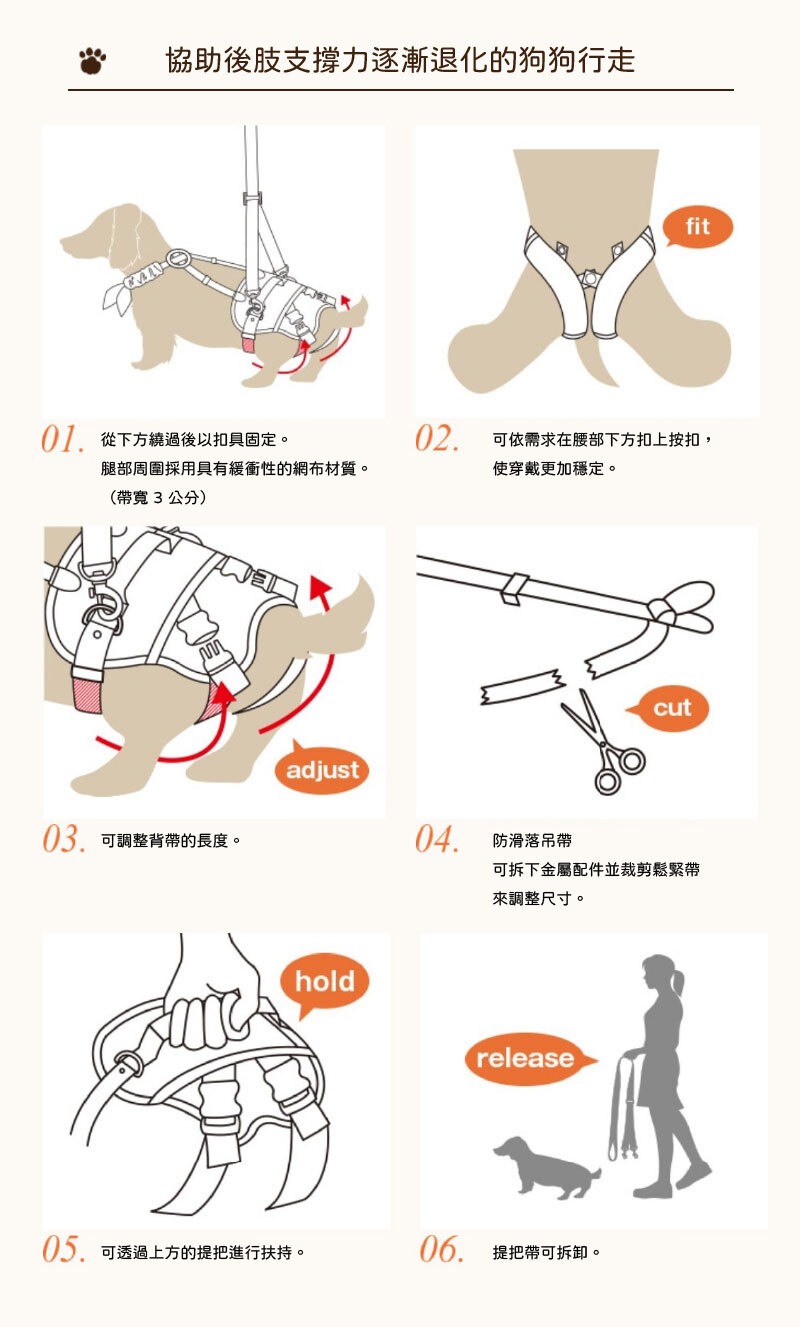 透過特製的輔助帶,讓腿部力量逐漸衰退的狗狗,能在主人的給予協助下繼續行走,達到輔助狗狗腿部肌肉力量的效果。