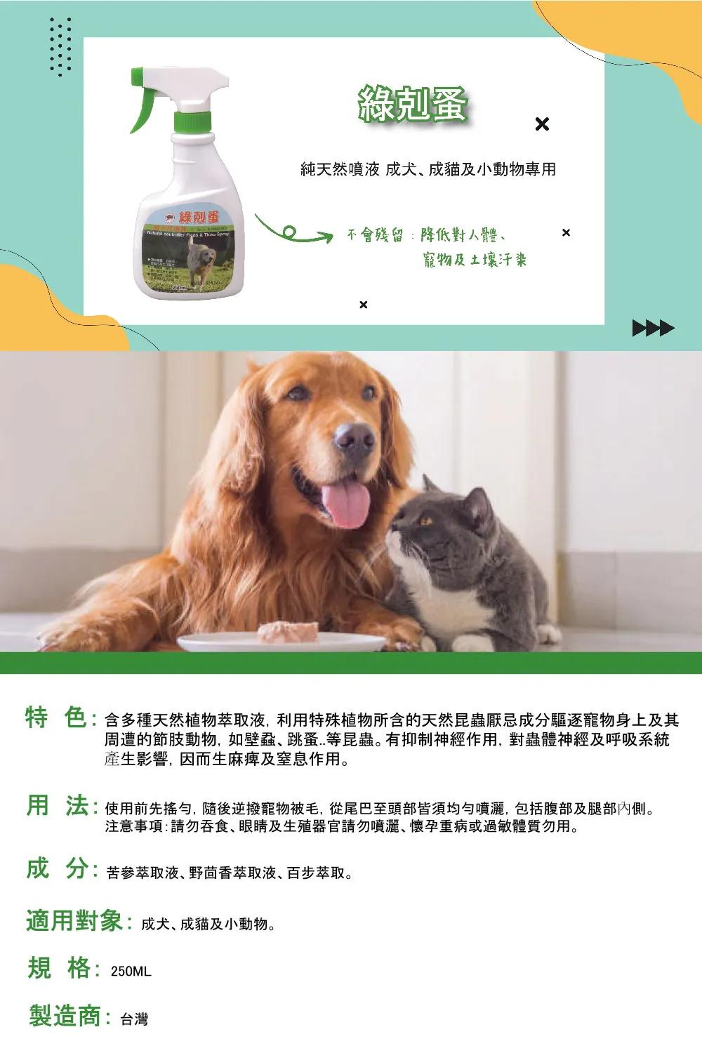 含多種天然植物萃取液,可驅除寵物身上及周遭環境 壁蝨、跳蚤等昆蟲。