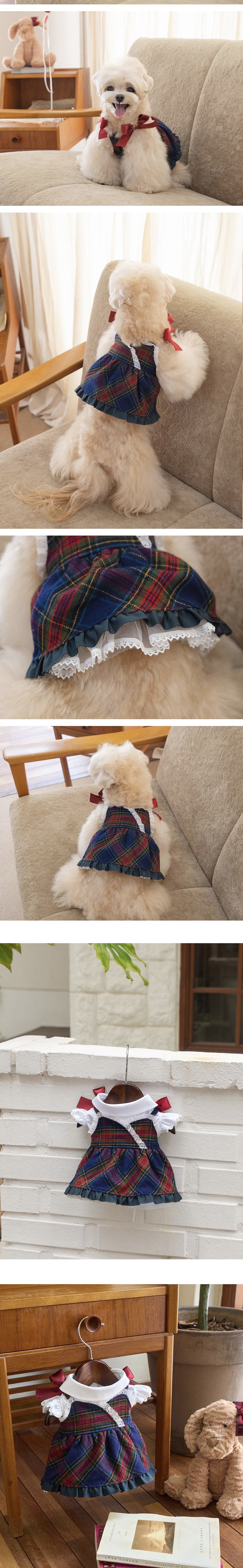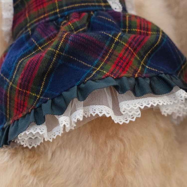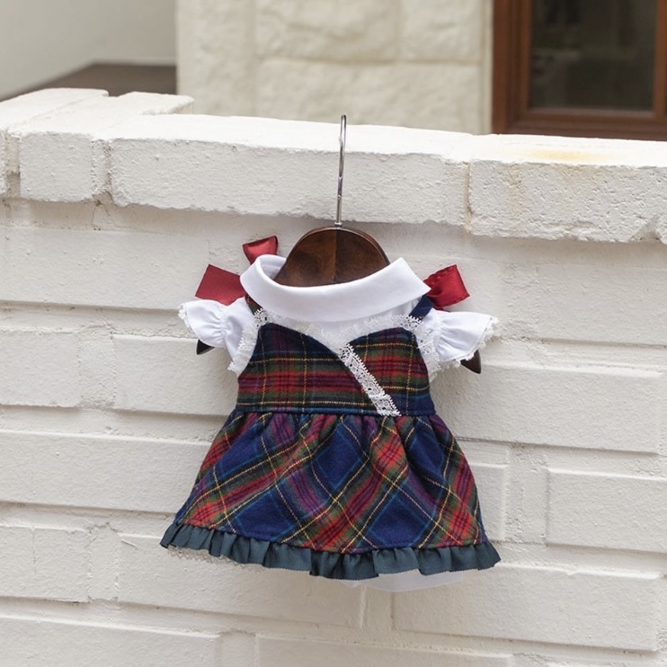 以紅藍格紋布料搭配胸前緞帶蝴蝶結,點綴細緻蕾絲與荷葉裙襬,展現高雅學院氣息。