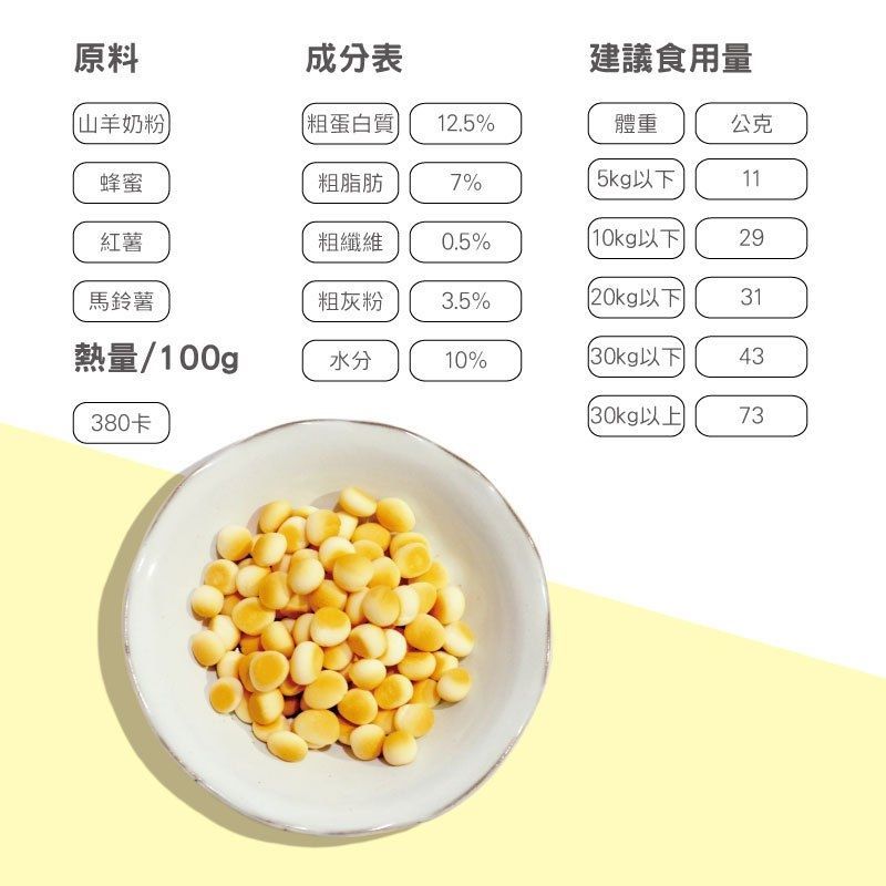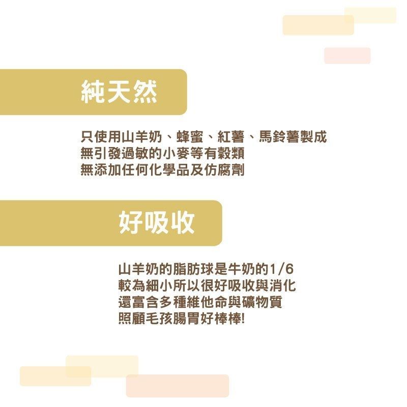 除了主成份山羊奶外還添加了蜂蜜、紅薯、馬鈴薯且不用小麥等穀物來製作山羊奶的脂肪球為牛奶的1/6分子小易吸收!吃得更健康!