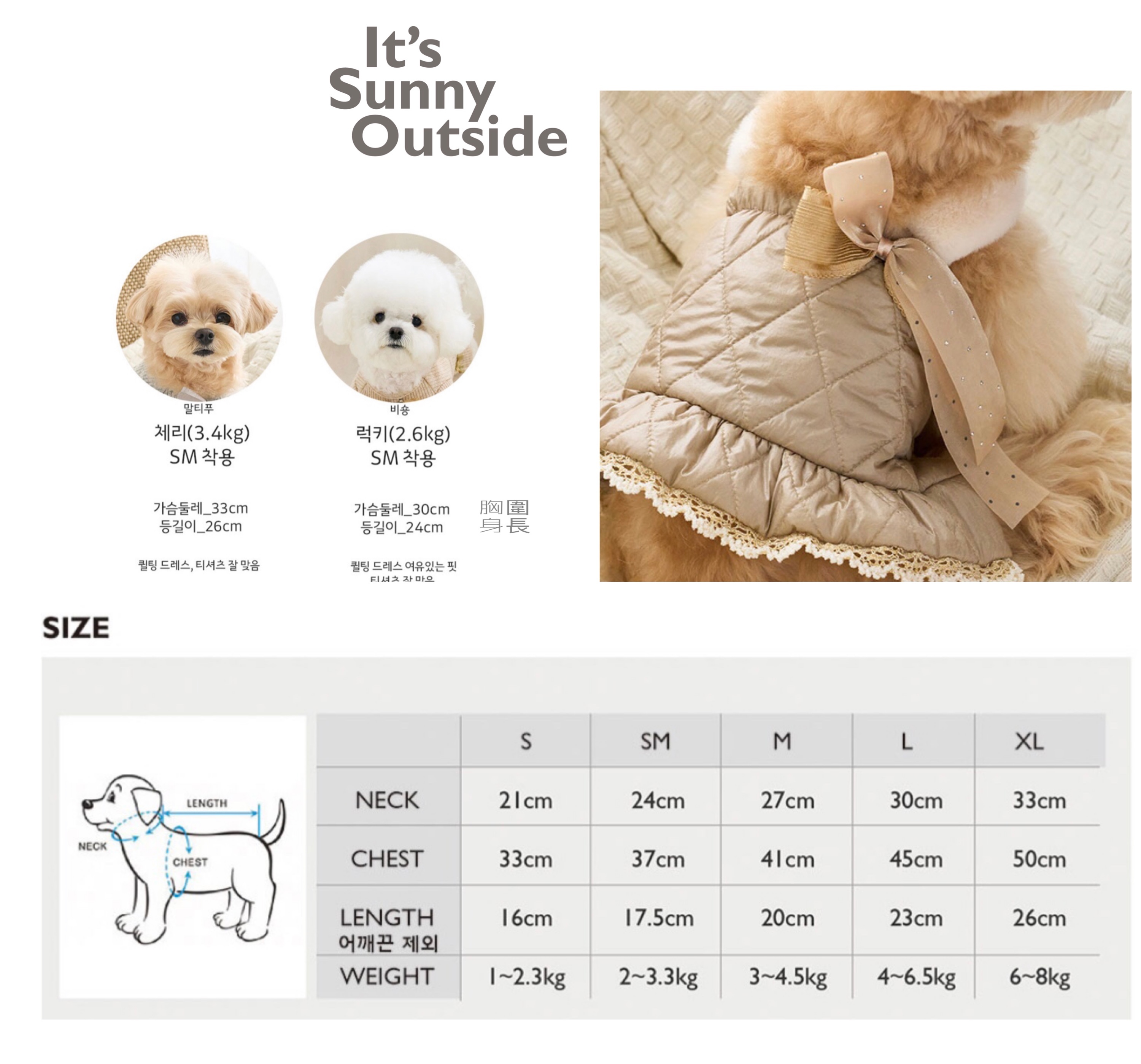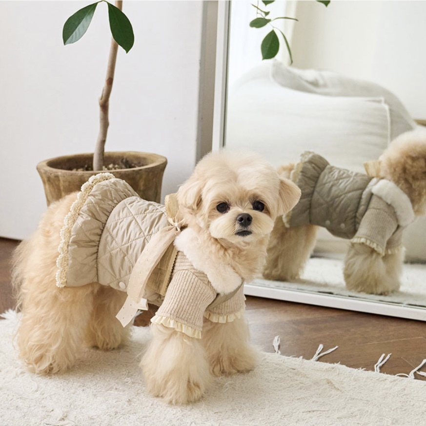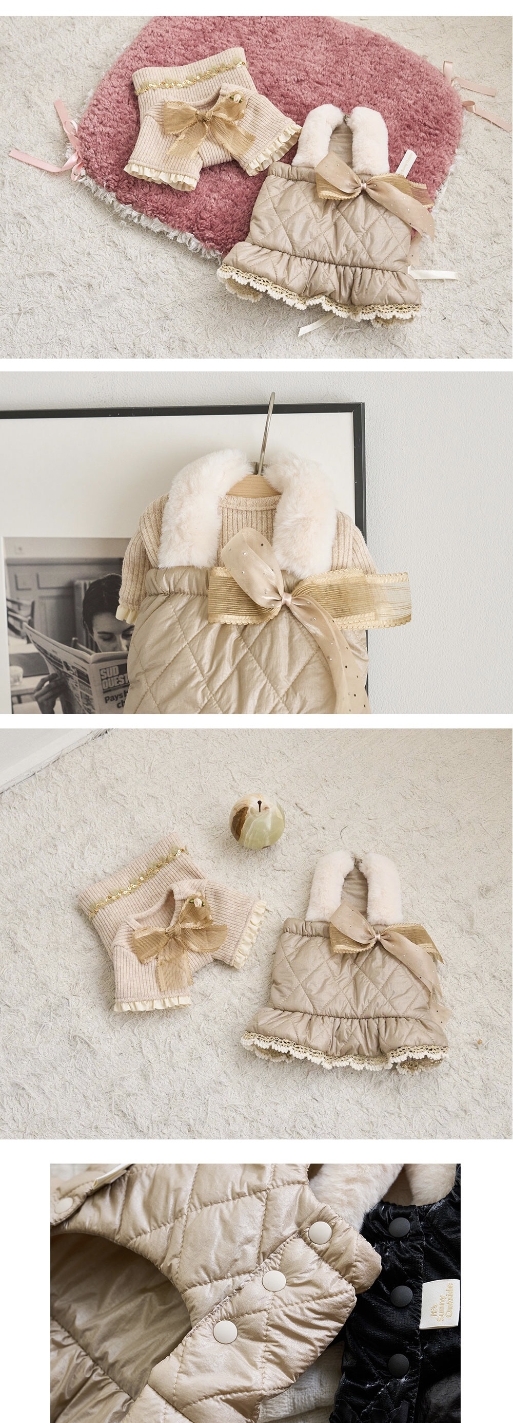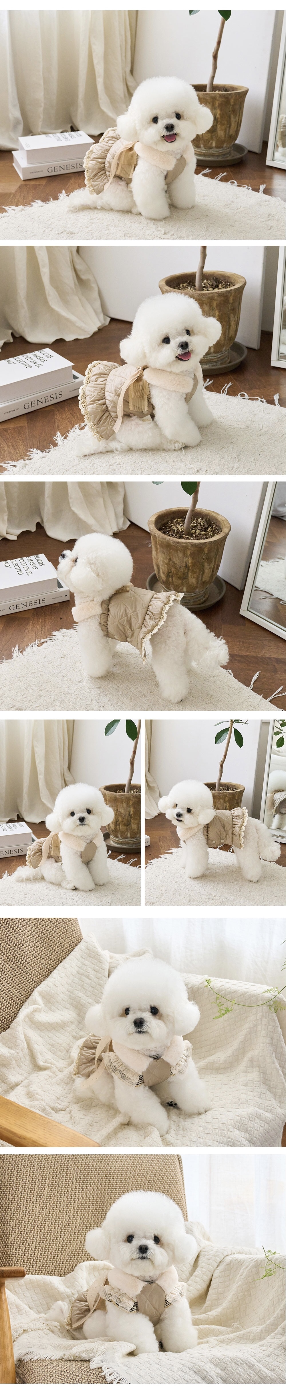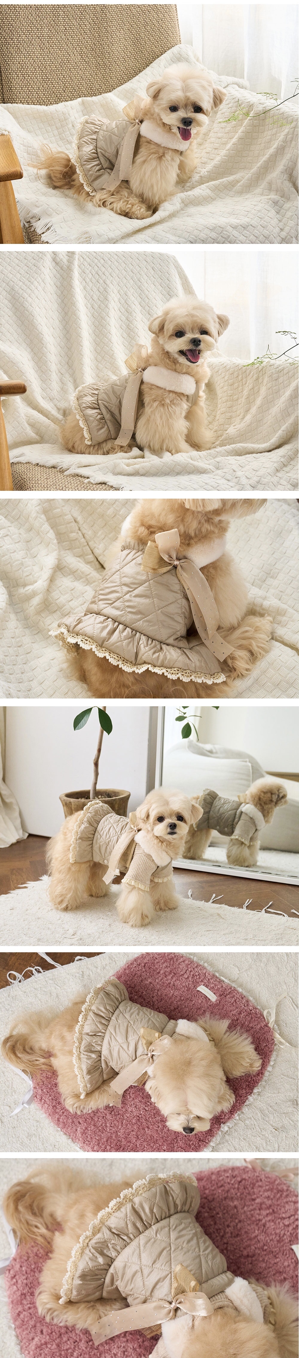 它採用迷人的金米色,帶有隱隱微妙的閃亮光澤,肩帶採用 柔軟的高密度毛皮製成,裙擺飾有金線蕾絲, 打造出更奢華的浪漫!