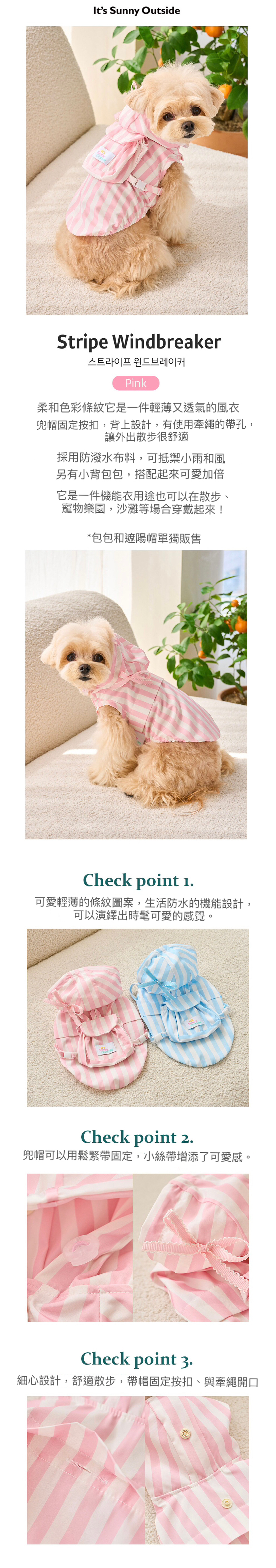 柔和色彩條紋它是一件輕薄又透氣的風衣 兜帽固定按扣,背上設計,有使用牽繩的帶孔, 讓外出散步很舒適