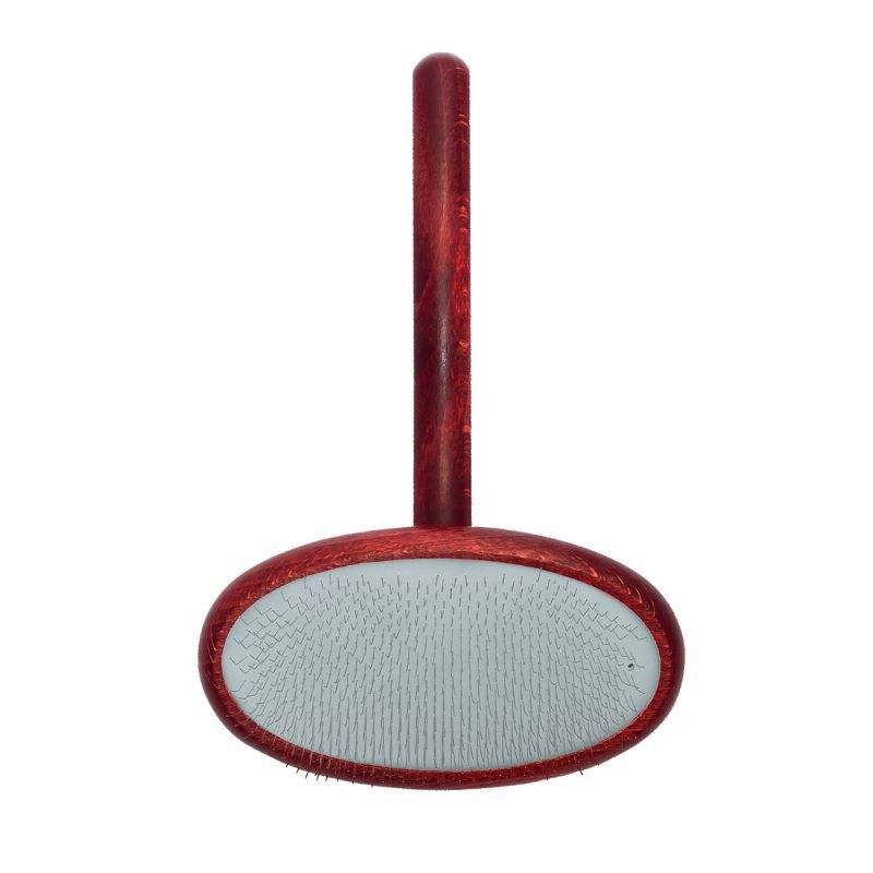 柔軟的天然橡膠氣墊上嵌有鍍鎳不鏽梳針,梳針以最佳角度排列,兼具柔和與高效梳理力。梳針能穿透毛髮,減少拉扯、避免刮傷皮膚。手柄採高品質山毛櫸木製作,符合人體工學設計,握感舒適。